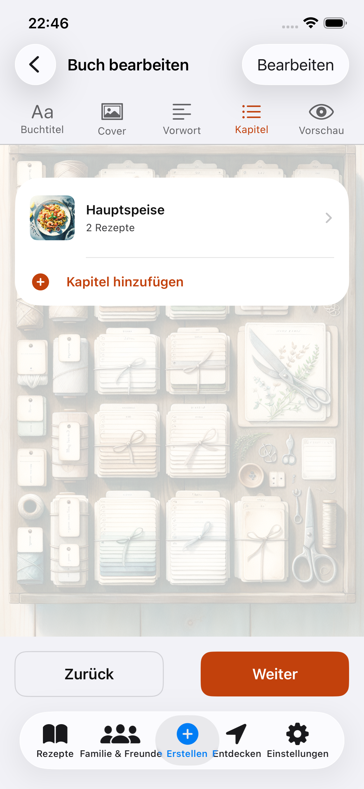 Gestalte dein eigenes Familienrezeptbuch mit Cover, Kapiteln und Vorschau.