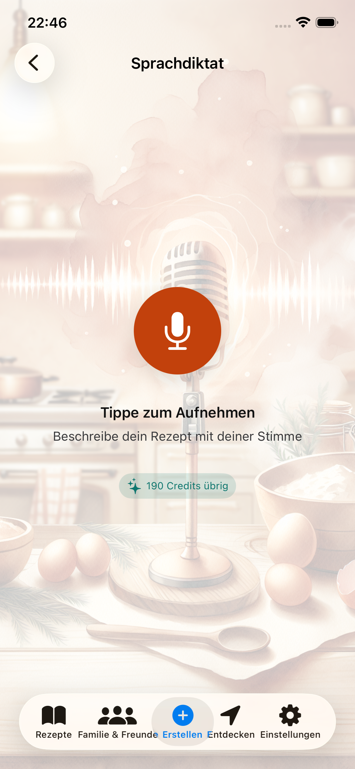 Diktiere dein Rezept einfach per Stimme — die KI wandelt es in ein strukturiertes Rezept um.